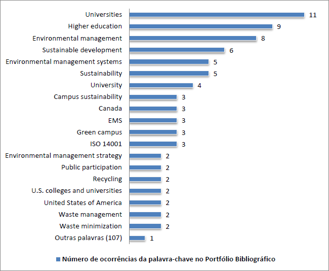 Por fim, a palavra-chave mais adotada pelos artigos do Portfólio Bibliográfico foi “Universities”, seguida por “Higher education” e “Environmental management”, as quais foram utilizadas pelos autores deste trabalho na execução da metodologia.