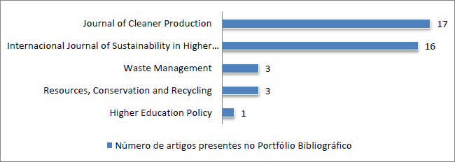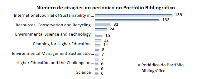 No que diz respeito aos periódicos que publicaram os artigos citados nas referências do portfólio, do mesmo modo que o trabalho de Chaves et al. (2013), os que mais se destacaram foram o International Journal of Sustainability in Higher Education e o Journal of Cleaner Production com grande vantagem sobre os demais, reafirmando a concepção de serem os mais expressivos para a temática da pesquisa.