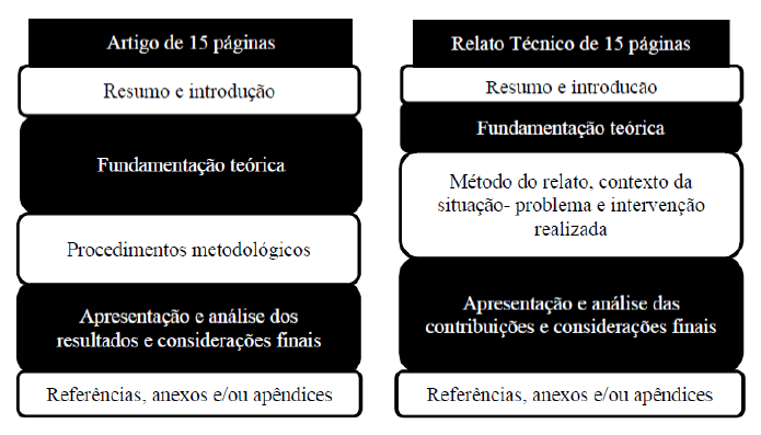 A própria estrutura do relato tecnológico no site da ANPAD segue a estrutura do protocolo de relato técnico descrito por Biancolino et al. (2012), ou seja, deverá ser elaborada com: a) Introdução; b) Contexto e a realidade investigada; c) Diagnóstico da situação-problema e/ou oportunidade; d) Análise da Situação-Problema e propostas de inovação/intervenção/recomendação; e) Contribuição Tecnológica/Social. Portanto, para título de melhor compreensão no presente trabalho, considerou-se relato técnico, relato tecnológico e artigo tecnológico como o mesmo tipo de produção.