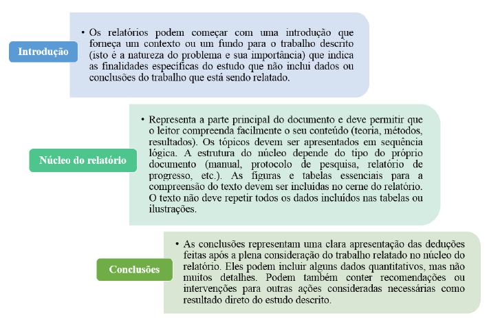 Segundo o Grey Literature International Steering Committee (GLISC, 2005), o corpo de um relatório técnico poderá ser estruturado de acordo com o seu conteúdo e complexidade em introdução, núcleo do relatório e conclusões (Figura 2).
