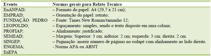 Metodología/enfoque: el estudio del enfoque cualitativo, exploratorio, descriptivo y explicativo se basó en encuestas de convocatorias de eventos y anales de publicaciones en reuniones científicas en el área de Administración, Ciencias Contabilidad y turismo, que presentaron normas específicas para los informes técnicos.
