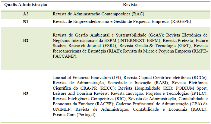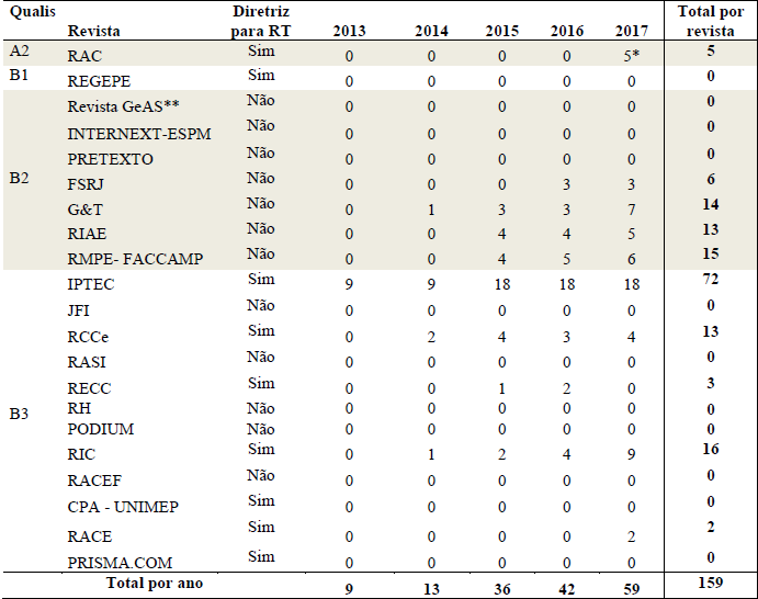 Ainda como estratégia de pesquisa, foi realizado o levantamento de publicações de relatos técnicos e artigos tecnológicos entre os anos de 2013 a 2017, em periódicos da área de Administração, Ciências Contábeis e Turismo Qualis A2, B1, B2 e B3, foi realizada com base nos seguintes descritores: relato técnico, relatório técnico e artigo tecnológico, entretanto, como critério de exclusão, não foram considerados periódicos Qualis B4, B5 e C, tampouco em eventos e revistas lançadas dos anos anteriores a 2013, visto que as primeiras diretrizes e protocolos criados e publicados para o desenvolvimento de relato técnico surgiram a partir do ano de 2012.