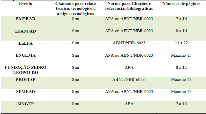 A limitação da pesquisa foi observada em relação ao Encontro da ANPAD (EnANPAD), uma vez que não houve reconhecimento dos descritores “relatos técnicos, relatos tecnológicos e/ou artigos tecnológicos” para as buscas nos anais anuais do evento, mesmo havendo chamadas com diretrizes para submissões de relatos tecnológicos, que posteriormente passaram a ser designados como “artigos tecnológicos”, nas últimas edições. Para os demais eventos, foram observadas algumas alterações de diretrizes na elaboração de relatos técnicos, tais como adoção das normas ABNT e/ou APA para referências e limites de páginas, de acordo com a Tabela 1.