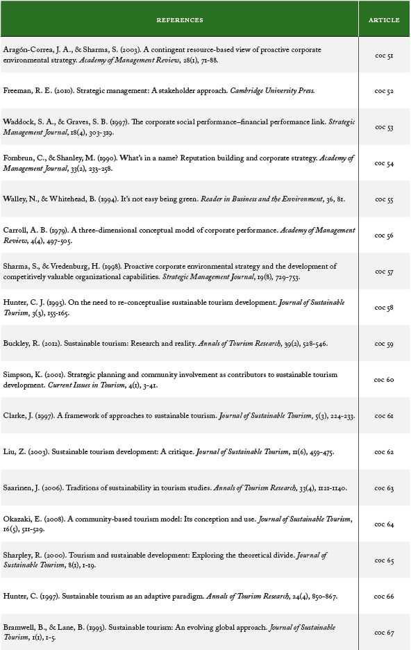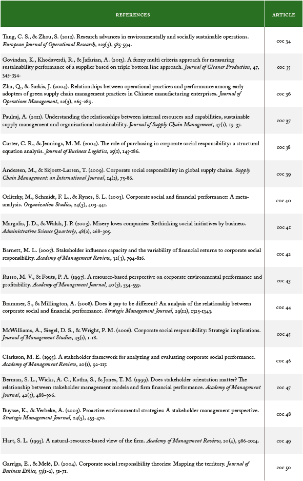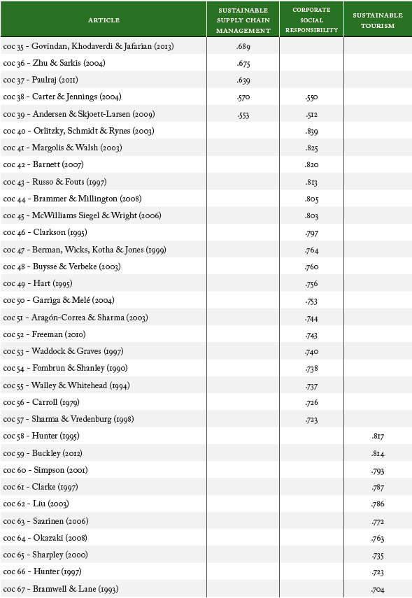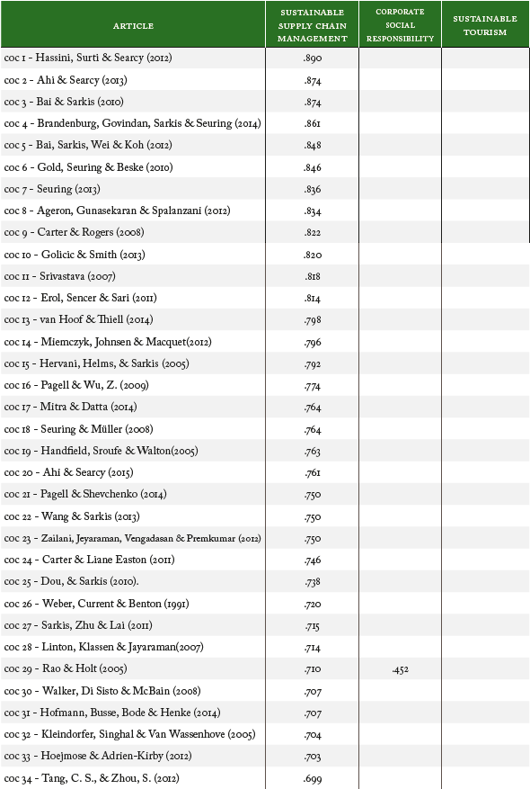 Co-citation analysis identified three components. The first component was called “Sustainable Supply Chain Management” and encompassed theoretical studies on the topic, as well as research relating this concept to organizational performance, supplier selection and future research agendas. The second was called “Corporate Social Responsibility” with studies that addressed various theoretical perspectives in the light of stakeholder theory, Resource-based View and analysis of the relationship between corporate social performance and financial performance. Finally, the last component was named “Sustainable Tourism” with a mainstream of theoretical studies.