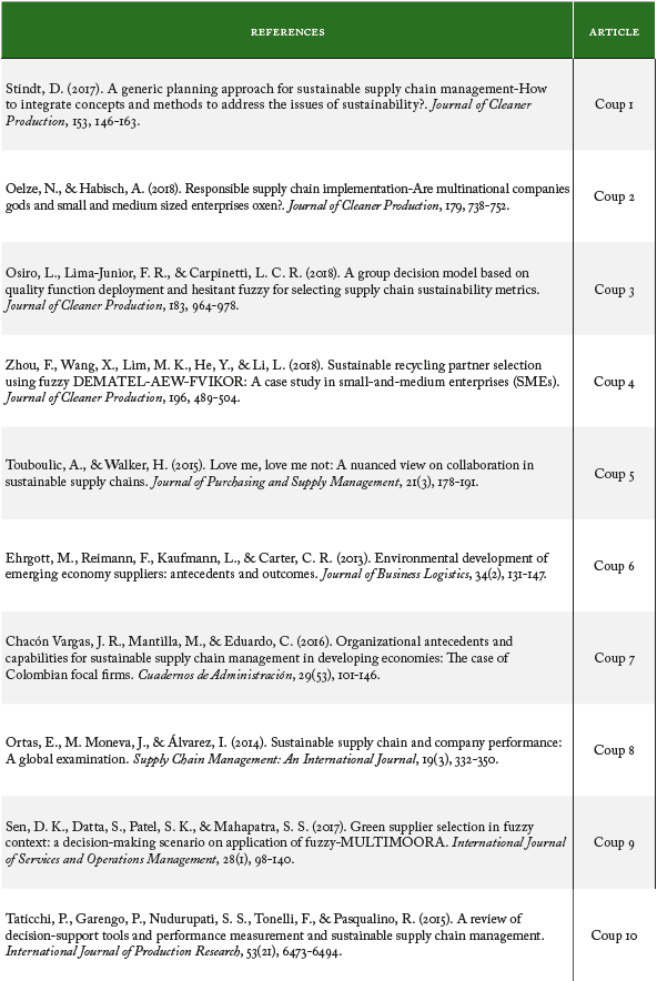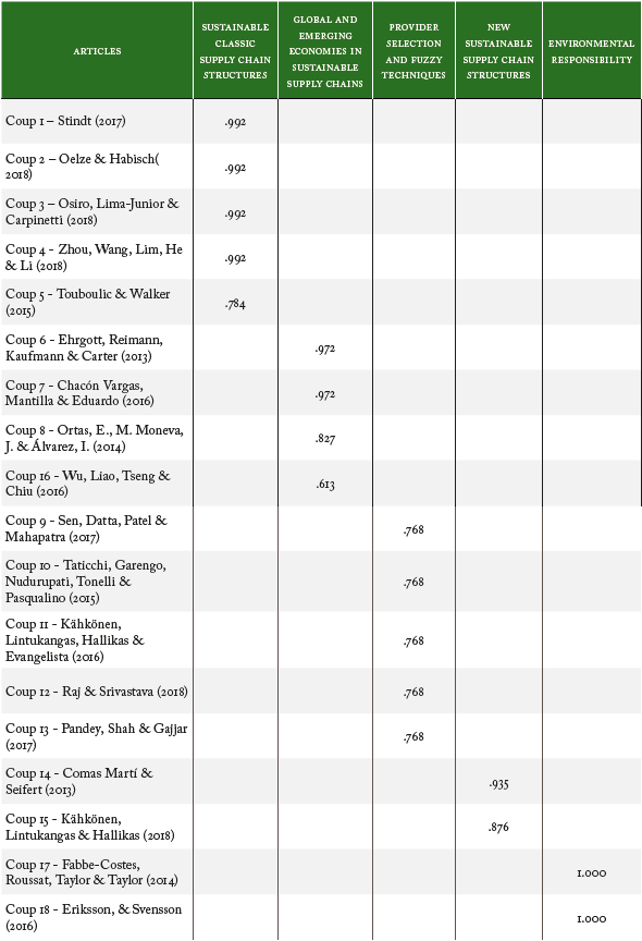 In the continuity of the study, when conducting the analysis of co-citation and bibliographic pairing, there is a predominance of contents related to the Sustainable Supply Chain. In the most representative articles in this sample, the authors discuss their considerations and conclusions on the implementation, efficiency and management of the Sustainable Supply Chain. Some examples are: coc 1 - Hassini, Surti and Searcy (2012), coc 2 - Ahi and Searcy (2013) with conceptual proposals on the subject. Other articles limit the research question to a traditional setting, such as: coup 1 - Stindt (2017) and coup 2 - Oelze and Habisch (2018). Other articles in the sample broaden the discussions to a global context, including economic, social and environmental issues in developed and emerging markets, as follows: coup 6 - Ehrgott, Reimann, Kaufmann and Carter (2013), coup 7 - Chacón Vargas, Mantilla and Eduardo (2016).