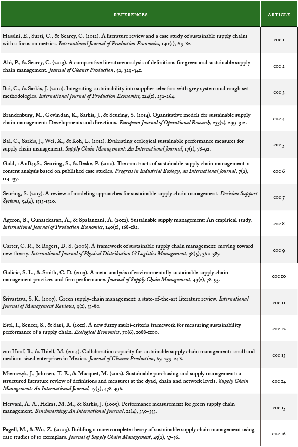 The first component we call “Classical Sustainable Supply Chain Frameworks” and consists of five sample articles dealing with research on sustainable supply chain management. Conceptually, all five articles analyze frameworks and metrics related to sustainable supply chain management performance. The first article, Stindt (2017), is a theoretical essay proposing a sustainable supply chain management planning framework. Oelze & Habisch (2018) applied a typology of Responsible Supply Chain Management in 10 cases (5 multinationals and 5 small companies) using Eisenhardt’s (1989) approach with 29 interviews (Miles & Huberman, 1994) along with triangulation of data (Patton). Osiro, Lima-Junior and Carpinetti (2018) propose supply chain sustainability assessment metrics based on previous literature studies and test them using Quality Function Deployment (QFD) matrix and expert assessment. Zhou, Wang, Lim, He and Li (2018) is a background analysis of the supply chain background in selecting sustainable partners employing Multi Criteria Decision Making (MCDM) using quantitative equations with a fuzzy approach, plus 5 experts to evaluate the dashboard metrics. Finally, Touboulic and Walker (2015) assesses the Collaborative paradigm on Sustainable Supply Chain Management through action research on a network of 11 small agricultural suppliers from a large food multinational, with 37 interviews, data triangulation (Patton) and single case study approach (Yin).