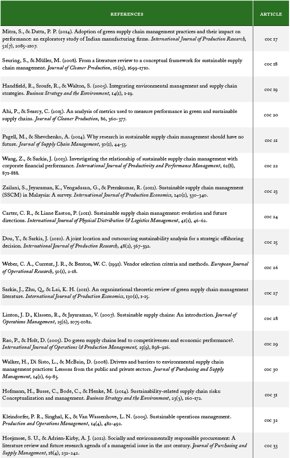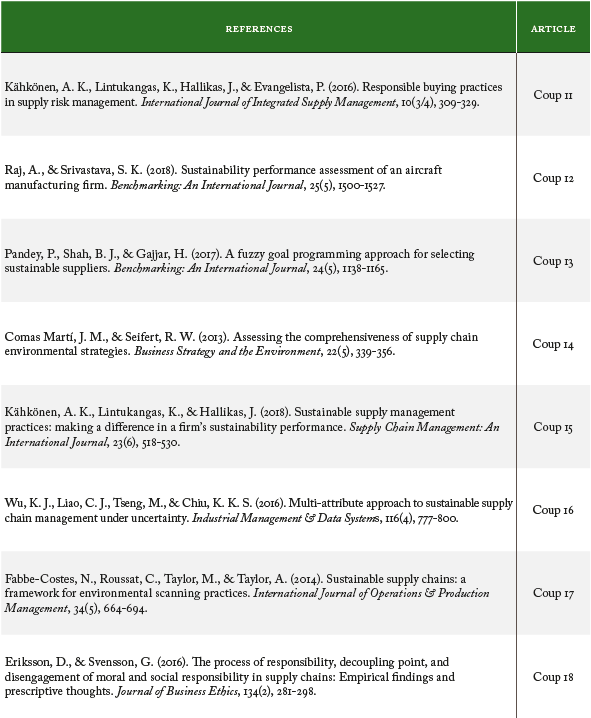 Finally, the fifth component, Environmental Responsibility, consisting of 2 articles, deals with moral and ethical issues of Sustainable Supply Chain management. Fabbe-Costes, Roussat, Taylor and Taylor (2014) is an analysis of environmental scanning (ES) practices for sustainable supply chain management (SSCM) and was prepared with 45 semi-structured interviews with professionals along with validation of results with a focus group of supply chain specialists. Eriksson and Svensson (2016) analyze moral disengagement in sustainable business supply chains (Business Sustainability - Bsus) based on qualitative multicase research (Eisenhardt, 1989).