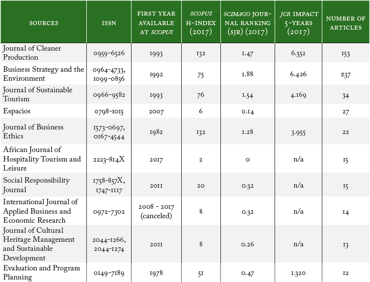 Our sample is comprised of 1,292 articles published in 440 Scopus-indexed journals during a 20-year period (1999-2018). According to Table 1, the journal with the most articles in our sample is the Journal of Cleaner Production, being one of the main outlets for sustainability research in management, business and organizations. It has, in 2017, an H-index of 132, a Scimago Journal Rankings (SJR) score of 1.47 and Journal Citation Report (JCR) 5-year impact of 6.352. Although it is the most prolific journal in our sample it is not the most impactful. That title belongs to Business Strategy and the Environment with 2017 stats of 75 H-index, 1.88 SJR and 6.426 and JCR 5-year impact.
