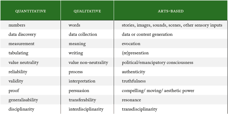 By creatively employing artistic methods in social scientific inquiry, an alternative form of production of knowledge and communication has been developed over the past two decades. Artsbased research now provides, despite some overlaps with the logic of qualitative-interpretative research, a distinct methodological approach alongside traditional quantitative and qualitative methodologies as pointed out by Leavy (2015, Table 1).