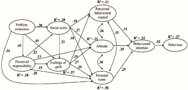 Bamberg and Möser (2007) carried out a new review of determining factors mentioned in scientific literature. Among the results of this macro comparative study, it can be highlighted that there are significant correlations between psychosocial variables and pro-environmental behavior, which are similar to the ones reported by Hines, et al., 1987. These correlations confirm that the variable Intention of pro-environmental behavior mediates the impact of all other psychosocial variables (accounting for 27% of the variance). The results also confirm that after Attitude and Behavioral Control, Personal Moral Norms are the third predictor of Intention of pro-environmental behavior (accounting for 52% of the variance).