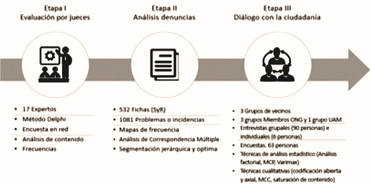 Stage III. Dialog with citizens. 3 groups of neighbors.3 groups members of ONG and 1 group UAM. Group interview (90 people) and individuals (6 people). Surveys (63 people). Statistical analysis techniques (factorial analysis, MCP, Varimax). Qualitative techniques (open and axial coding, MCC, content saturation)