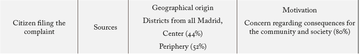 Thus, it can be concluded that the determinants will differ in relation to who files the complaint. The environmental commitment associated with pro-environmental values (internal elements to people) is the engine that motivates the actions of the ones that are most involved or aware of the environmental cause. The complaint would be a manifestation of their commitment, regardless of the difficulties they might face after filing the complaint. They aim at making an impact on the administration and the authorities so they solve the problem. On the other hand, for those who show lower or circumstantial commitment, the determining factors will be contextual and institutional, such as the possibilities of reception or success when filing a complaint.