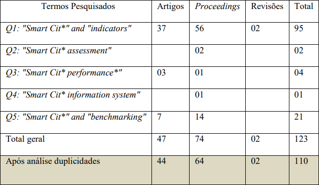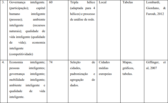 Estas 04 publicações foram selecionadas uma vez que, como a proposta deste trabalho é que a denominação de cidade inteligente possa ser avaliada dentro de sua complexidade, optou-se por realizar análise comparativa de sistemas de indicadores mais amplos em razão do número de indicadores e de categorias mais variadas.