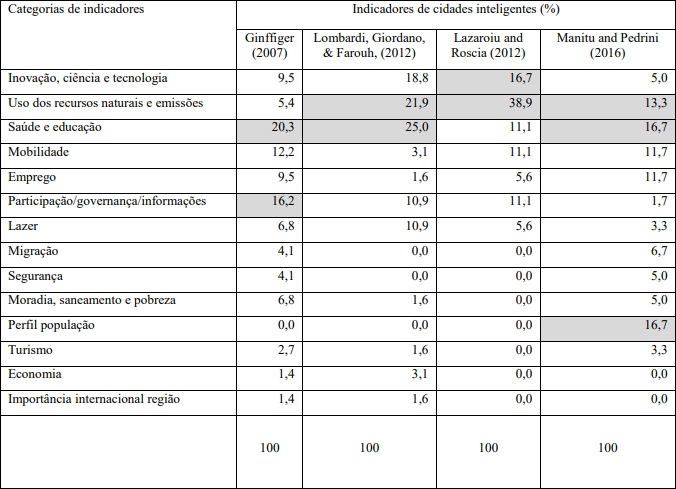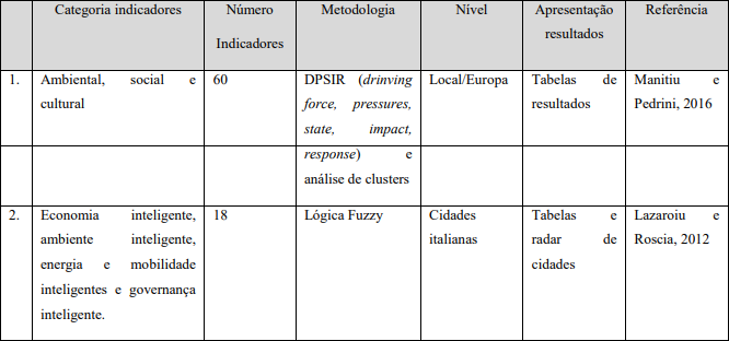 A categorização dos indicadores foi realizada por análise de conteúdo dos indicadores dos 04 artigos, resultando nas seguintes categorias: inovação, ciência e tecnologia; uso dos recursos naturais e emissões; saúde e educação; mobilidade; emprego; participação, governança, informações; lazer; migração; segurança; moradia, saneamento e pobreza; perfil população; turismo; economia; importância internacional da região.