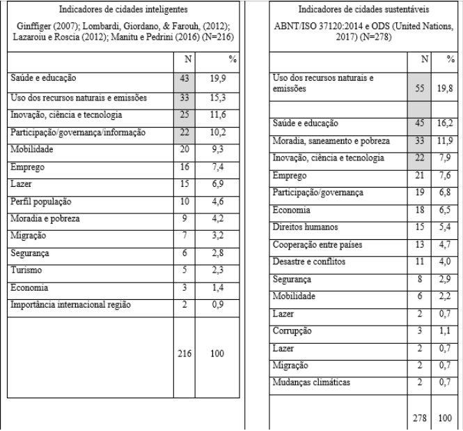 A análise comparativa dos indicadores de cidades inteligentes propostos nos 04 artigos é então realizada com os indicadores de cidades sustentáveis da ABNT/ISO 37120:2014 e os indicadores propostos pelos ODS (United Nations, 2017). Justifica-se a escolha destes dois sistemas por serem validados internacionalmente.