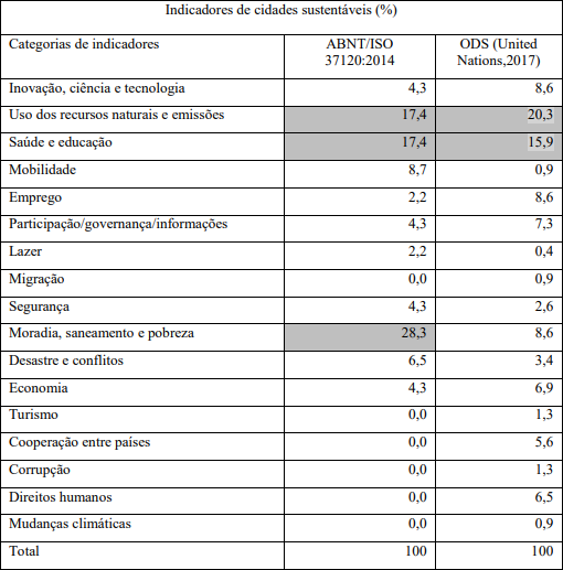 O mesmo foi feito para os indicadores de cidades sustentáveis da ABNT/ISO 37120:2014 e os indicadores propostos pelos ODS (United Nations, 2017) resultando nas mesmas categorias, além de: direitos humanos; cooperação entre países; desastre e conflitos; corrupção; mudanças climáticas. Embora situados por objetivo, os indicadores dos ODS algumas vezes se repetem e, para melhor análise foram reclassificados por temas comparáveis A porcentagem de cada categoria foi calculada em razão do número total de indicadores propostos em todas as categorias.