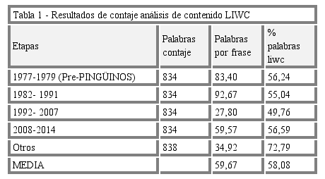 procede a la creación de un diccionario LIWC específico, posibilidad que el propio programa de análisis de contenido LIWC por defecto ofrece. Para su elaboración, se parte de un archivo único con el texto contenido en la cartelería promocional desde su inicio en 1982 hasta su última edición en 2014, incluyendo el período pre-pingüinos, desde 1977 a 1979. A partir del contaje automático de la herramienta AntConc3.2.1w, se registran 3.252 palabras y se genera un nuevo fichero de texto depurado con 514 palabras diferentes y un total de 3.008 palabras, teniendo en cuenta su frecuencia de repetición. En esta primera fase, se eliminan las palabras consideradas poco relevantes para el estudio, así como algunas otras incluidas dentro de las categorías del diccionario LIWC genérico y, por tanto, ya analizadas.