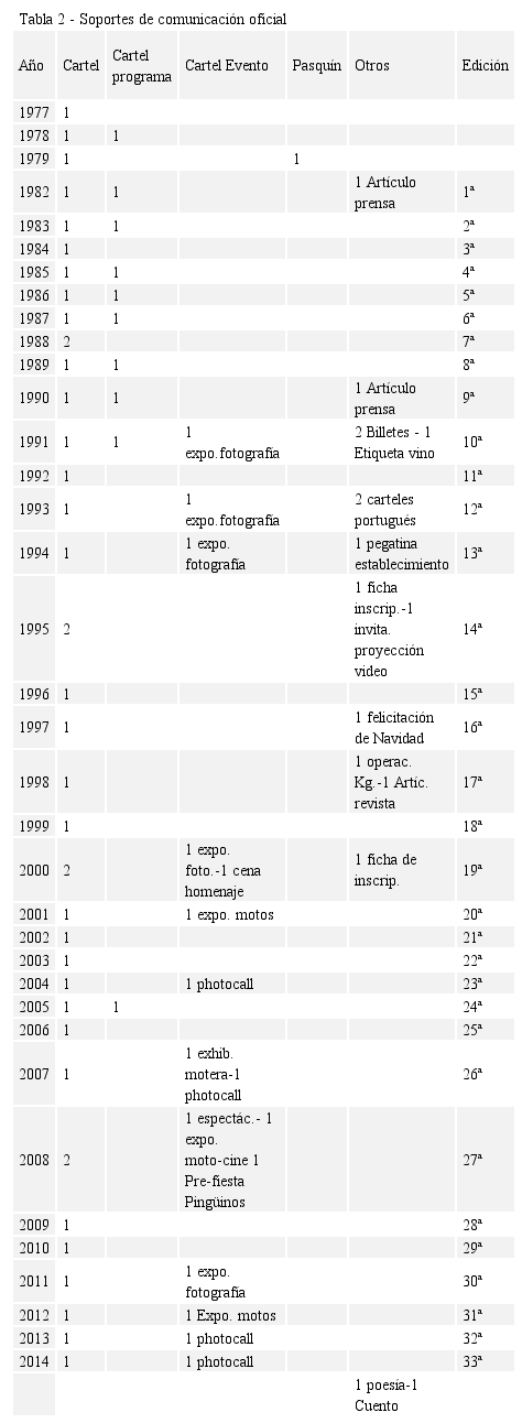 En total, más de 70 soportes publicitarios convencionales entre carteles, posters, flyers, pasquines, artículos de prensa y revista; medios secundarios below the line; y otros instrumentos de marketing directo y merchandising (invitaciones, felicitaciones, fichas de inscripción, moneda propia, etiquetas de vino, pegatinas establecimiento colaborador, etc.). Finalmente, la muestra queda constituida por 66 carteles correspondientes a las 32 ediciones de “Pingüinos” y a tres concentraciones de verano, antesala del evento, celebradas en los años 1977, 1978 y 1979, respectivamente. Una muestra de análisis que abarca así desde la primera edición, en el año 1982, hasta la última celebrada en el año 2014, incluyendo la etapa previa señalada que permite, desde una visión longitudinal, analizar los cambios habidos en el tiempo.