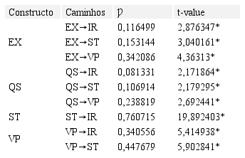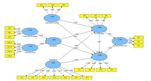 Para validar modelo o novo modelo estrutural, realizou-se novamente os testes de R2 ajustado, Q2, f2 e o Coeficiente de Caminhos (ƿ), conforme método proposto por Hair Jr et al. (2014) e Ringle et al. (2014). O coeficiente de caminhos foi comparado com o t-value, para um intervalo de confiança de 95% e verificou-se que os custos de troca apresentaram relações não-significantes.