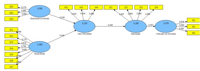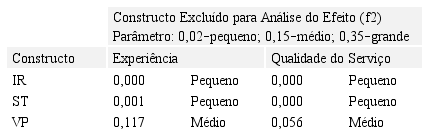 Observa-se que, com a reespecificação final, os indicadores de R2 Ajustado e Q2 continuaram a apresentar resultados semelhantes para a acurácia do constructo intenção de recompra. Portanto, tal reespecificação apresentou um modelo mais parcimonioso sem abrir mão da acurácia preditiva.