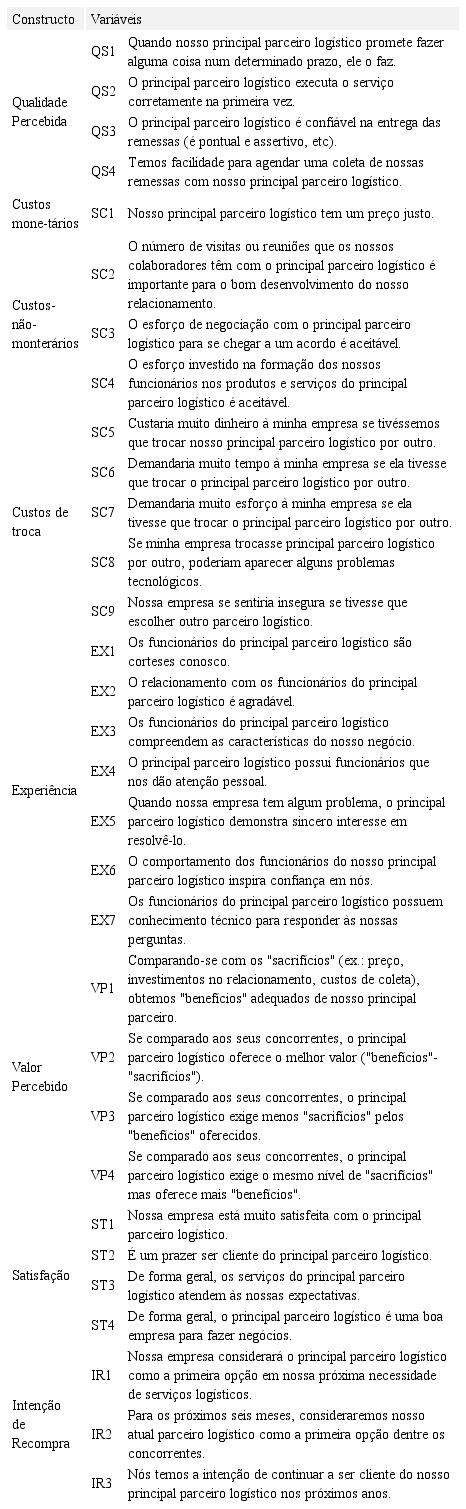 A presente pesquisa pode ser caracterizada como aplicada, empírica, descritiva e hipotético-dedutiva (Lakatos & Marconi, 2000). Quanto ao procedimento técnico, realizou-se um levantamento quantitativo-descritivo (Gil, 2002). O instrumento de coleta de dados proposto foi adaptado de escalas já testadas e publicadas: Parasauraman et al. (1988), Fiol et al. (2011), Eggert e Ulaga (2002) Fornell et al. (1996); Lam et al. (2004), Molinari, Abratt e Dion (2008) e Lapierre (2000), adequando-as aos objetivos desta pesquisa. O Quadro 1 apresenta as variáveis do instrumento de coleta de coleta de dados.