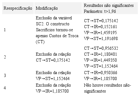 O modelo estrutural proposto apresentou algumas relações entre os constructos pouco significantes. Com a finalidade de sugerir um modelo mais adequado, procedeu-se com a reespecificação do modelo, conforme Ringle et al. (2014), baseando-se na significância (t-value) das relações entre os constructos, bem como na teoria que sustenta este trabalho (Quadro 2).