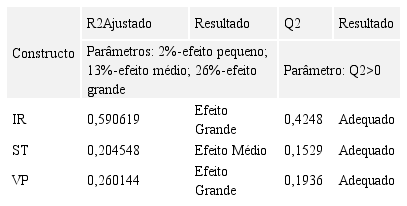 Atendidos os parâmetros de validade discriminante e convergente, apresenta-se a avaliação do modelo estrutural e a MEEPLS, considerando 4 variáveis exógenas: qualidade do serviço (3 variáveis), sacrifícios, constructo de segunda ordem composto por duas variáveis exógenas: custos não-monetários (1 variável) e custos de troca (4 variáveis), experiência (7 variáveis); e três variáveis endógenas: valor percebido (3 variáveis), satisfação (4 variáveis) e intenção de recompra (3 variáveis). O Coeficiente de Determinação (R2) ajustado, Coeficiente de Redundância Cross-validado (Q2), o Tamanho do Efeito (f2) e o Coeficiente de Caminhos (ƿ) foram analisados conforme método proposto por Hair Jr et al. (2014). O coeficiente de caminhos (ƿ) foi comparado ao t-value, para um intervalo de confiança de 95%. Os t-values foram gerados pela técnica de Bootstrapping do SMARTPLS 2.0 M3 (Ringle, Wende & Will, 2005), e considerou-se para a análise, os efeitos totais (Ringle et al., 2014).