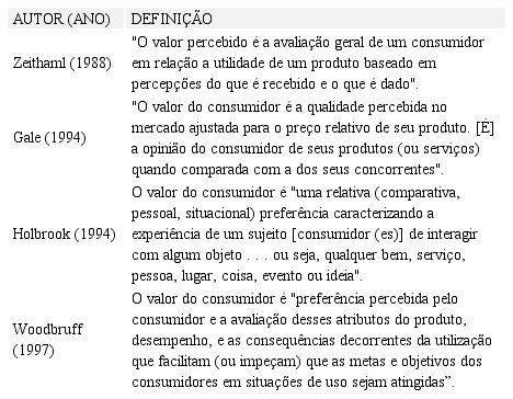 No intuito de elucidar o conceito de valor em relação ao consumidor, mais precisamente o valor percebido pelo consumidor, Graf e Maas (2008) apresentam um quadro conceitual (Quadro 1), com as principais definições de “valor percebido do consumidor”, onde pode-se observar as definições clássicas e geralmente aceitas a respeito do tema em questão.