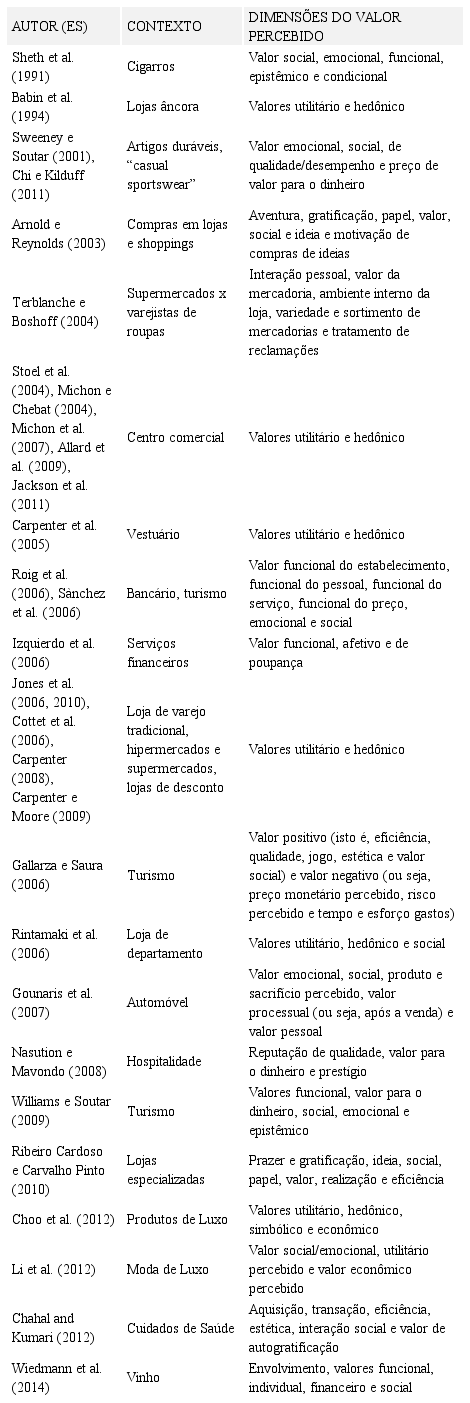 Nesse contexto, há de se ressaltar que o marco inicial de estudos relacionados a esses valores se deu no estudo de Sheth et. al. (1991), sendo que ao longo dos últimos anos vários estudos procuraram identificar as dimensões de valor percebido, onde em um apanhado geral, El-Adly e Eid (2017) apresentam em um quadro, Quadro 2, essas dimensões de valor percebido que foram utilizadas em pesquisas ao longo dos últimos anos, bem como o contexto no qual foram empregadas, além dos autores que escreveram sobre o assunto.