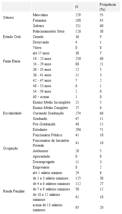 Vale destacar que pouco mais de 81% do total de respondentes da amostra estão distribuídos na faixa etária de 18 a 29 anos, por outro lado, somente 7,19% dos consumidores possuía menos de 17 anos (30 respondentes). Sendo assim, pouco menos de 12% da amostra era de consumidores que tinham mais de 30 anos. Em relação ao nível de escolaridade, identificou-se que 274 indivíduos estavam cursando graduação no período da coleta dos dados, ou seja, os consumidores com esse nível de escolaridade representavam aproximadamente 66% do total da amostra da coleta de dados. Nota-se a partir dos dados da Tabela 1 que do total de respondentes, algo em torno de 88% possuíam um grau de instrução elevado, dado que 66% estavam cursando graduação, 11% já tinham concluído a graduação e 11% já possuíam uma pós-graduação. Em contrapartida, afere-se que somente 5% dos consumidores (21 indivíduos) tinham o ensino médio incompleto e por volta de 6%, ou seja, 27 respondentes já haviam concluído o ensino médio.