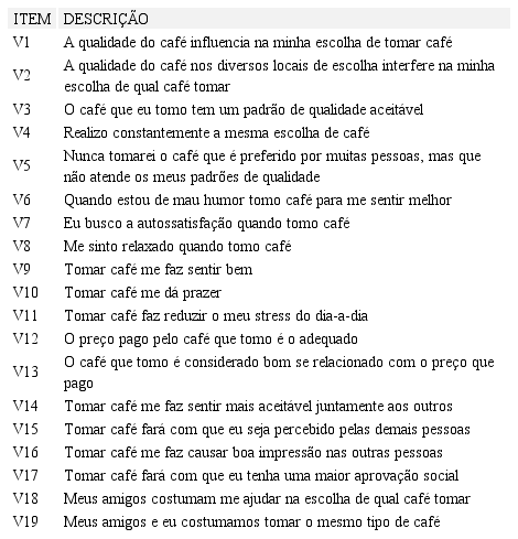 A legenda, exposta no Quadro 3 a seguir, descreve as variáveis nas quais cada item está representado. Cabe ressaltar que as variáveis utilizadas foram adaptadas para o consumo de café e foram originadas dos estudos de Sweeney e Soutar (2001) e Hennigs et al. (2012).