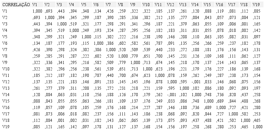 Portanto, os altos índices de correlação citados entre os itens aferidos podem indicar a presença desses itens em um mesmo fator. No entanto, em contrapartida, observa-se que a correlação entre os itens V12 e V14 foi a única negativa (-0,001), desse modo, pode-se constatar que esses itens não estão englobados por um mesmo fator, ou seja, se alocariam em fatores distintos.