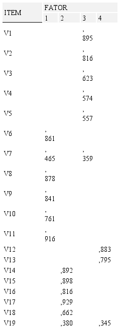 Portanto, após a realização da AFE, para realização da mensuração da correlação entre os dezenove itens de pesquisa, conforme pode ser verificado os resultados na Tabela 2 anteriormente, foi realizada ainda uma rotação fatorial, para a realização dos ajustes, e nesta, identificou-se que os itens que podem ser agrupados em cada um dos quatro fatores, podem ser observados através dos dados expostos na Tabela 3 a seguir.