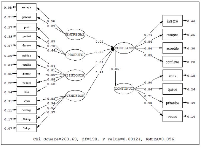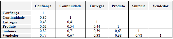 As dimensões dos antecedentes da confiança, Mix de produtos, Entregas, Sintonia e Vendedor, apresentam validade discriminante, apesar de uma correlação entre os fatores Sintonia e Vendedor acima do recomendado. Assim como já identificado na AFE, isto deve-se ao fato dos pequenos varejistas imaginarem que a sintonia com o fornecedor ocorreria pelo esforço do vendedor, único contato do cliente com o fabricante. Foram mantidos os dois fatores antecedentes, pois a AFE preliminar apresentou uma solução com estes fatores, em obediência a recomendação de Gerbing e Anderson (1988). A tabela 3, que sintetiza as correlações, também indica que, em nenhum par destes construtos verificam-se correlações superiores a 0,90 (Hair et al., 1998), não havendo necessidade de reformulação do modelo.