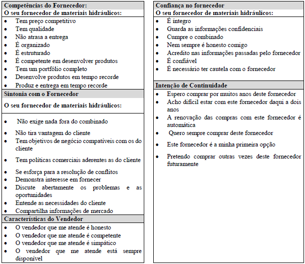 O presente estudo é composto por duas etapas. A primeira é qualitativa e consistiu na análise da bibliografia e numa pesquisa exploratória com o gestor comercial de um grande fornecedor de materiais de construção hidráulicos. Isto possibilitou o desenvolvimento e aprimoramento de um questionário, pré-testado e refinado e finalmente aplicado pela internet. O questionário preliminar, elaborado a partir desta primeira etapa, utilizou escalas de sete pontos para os atributos pesquisados, variando de discordo completamente (1) para concordo plenamente (7). Para a mensuração dos antecedentes da confiança foi adaptada a escala utilizada por Frederico e Robic (2008) composta pelas dimensões competências do fornecedor, sintonia com o fornecedor e caraterísticas do vendedor. A mensuração da confiança foi baseada na escala utilizada por Doney e Cannon (1997). Para medir intenção de continuidade foi adotada a escala sugerida por Kumar, Sheer e Steemkamp (1995). O questionário preliminar foi respondido presencialmente, por cinco respondentes, pequenos varejistas, visando avaliar a adequação para aplicação posterior. Solicitava-se ao respondente avaliar o fornecedor de materiais hidráulicos em que o varejista havia efetuado o último pedido. A partir desta avaliação, pôde-se constatar que o questionário não teve grandes problemas de entendimento, permitindo a aplicação sem maiores alterações. Os itens avaliados são apresentados no quadro 4.