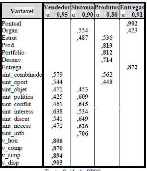 A análise fatorial dos antecedentes da confiança com o emprego do método de componentes principais e rotação Varimax mostrou-se adequada (KMO = 0,909 e 76% da variância explicada). Os itens preço e qualidade apresentaram baixa comunalidade e foram retirados da análise. Analisando-se os antecedentes da confiança, constata-se uma solução com quatro fatores, apresentados na tabela 1, nomeados Características do Vendedor, Sintonia com o Fornecedor, Mix de Produtos (derivado da dimensão competência em produtos) e Capacidade de Entrega (derivada da dimensão competência em serviços). Os fatores indicam validade convergente pelos coeficientes alpha de Cronbach entre 0,80 e 0,95.