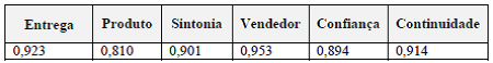 A análise fatorial da confiança mostrou-se adequada (KMO = 0,83 e variância extraída de 76%) e unidimensional. Três itens (“Guarda as informações confidenciais”, “Nem sempre é honesto comigo” e “É necessário ter cautela com o fornecedor”) foram desconsiderados pela baixa comunalidade. O alpha de Cronbach de 0,897 indica validade convergente para a escala. A análise fatorial para a Intenção de Continuidade mostrou-se adequada (KMO = 0,82 e variância extraída de 79%) e unidimensional. Dois itens (“Acho difícil estar com este fornecedor daqui a dois anos” e “A renovação das compras com este fornecedor é automática”) foram desconsiderados pela baixa comunalidade. O alpha de Cronbach de 0,903 indica validade convergente para a escala.