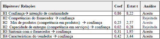 Verifica-se também o efeito mediador da confiança sobre a intenção de continuidade. Assim, H1 não é rejeitada, o poder explanatório é alto (R2 = 75%) e maior que o efeito direto dos antecedentes da confiança (R2 = 56%). Sugere-se que a construção da confiança ocorreria então a partir da percepção de uma atenção especial do vendedor, de um portfólio de produtos interessante e atual e disposição do fabricante para entender as necessidades do cliente. Em síntese, como apresentado na tabela 5, não se rejeitam as hipóteses H1, H3 e H4.