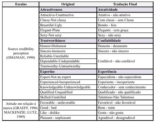 Antes de seus empregos na coleta, ambas as escalas passaram por uma tradução reversa (Malhotra, 2006). Três itens da dimensão de confiabilidade da escala de credibilidade receberam a mesma tradução em três etapas de retrotradução. Dessa forma, foram reduzidos a apenas um item. A Figura 1 mostra os itens das escalas nas versões originais e o resultado da tradução.