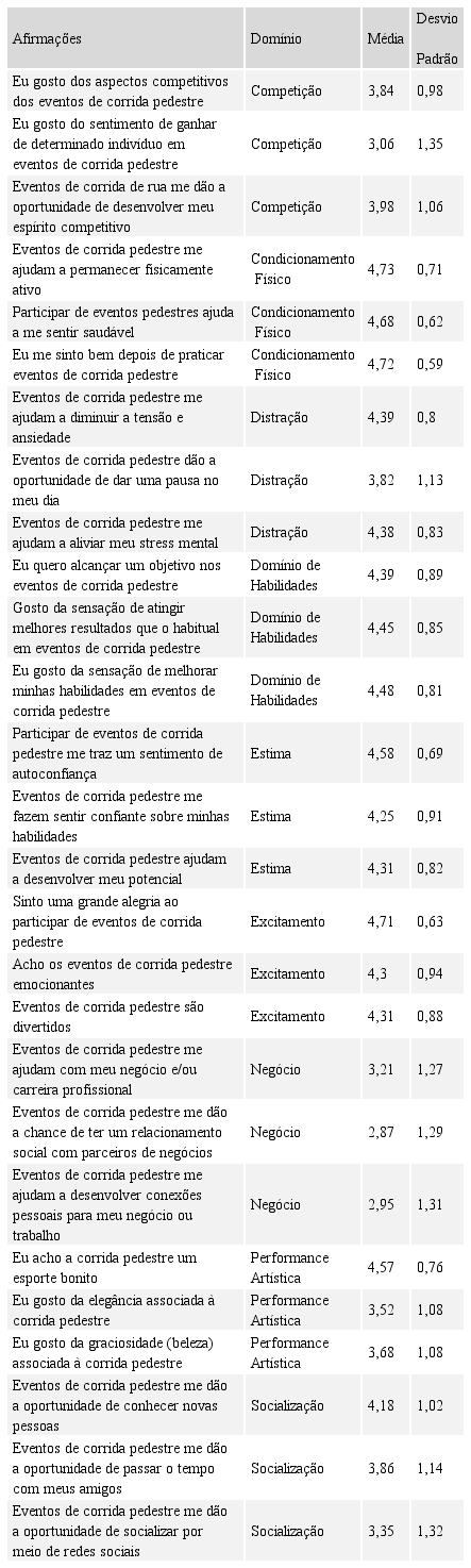 Em contrapartida, as afirmações com menor grau de concordância nas respostas, com médias 2,87 e 2,95, respectivamente, foram: “eventos de corrida pedestre me dão a chance de ter um relacionamento social com parceiros de negócios” e “eventos de corrida pedestre me ajudam a desenvolver conexões pessoais para meu negócio ou trabalho”, ambas ligadas à dimensão negócios. As afirmações e seus domínios podem ser visualizados de forma mais clara na Tabela 1, onde podemos observar a média aritmética e o desvio padrão de cada afirmação e à qual domínio a assertiva pertence.
