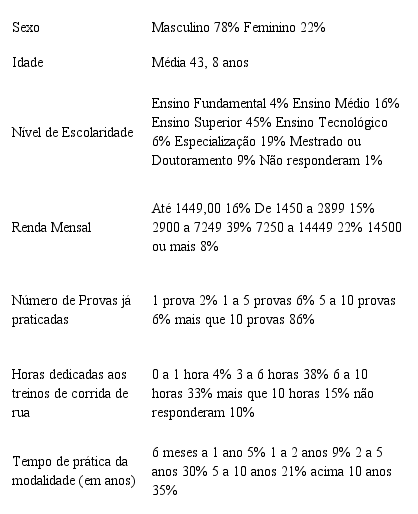 Outra discussão a ser feita neste artigo é sobre o perfil dos corredores deste estudo e seu grau de envolvimento com a corrida de rua. Para isso, as questões como idade, sexo, escolaridade e renda foram classificadas como dados sócio-demográficos. Para identificar o grau de envolvimento com a corrida de rua, o instrumento continha três perguntas relacionadas ao tempo médio semanal dedicado a treinos da modalidade, número de provas já participadas e tempo de prática (em anos).