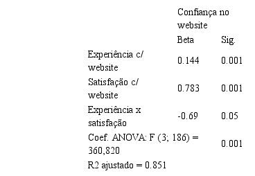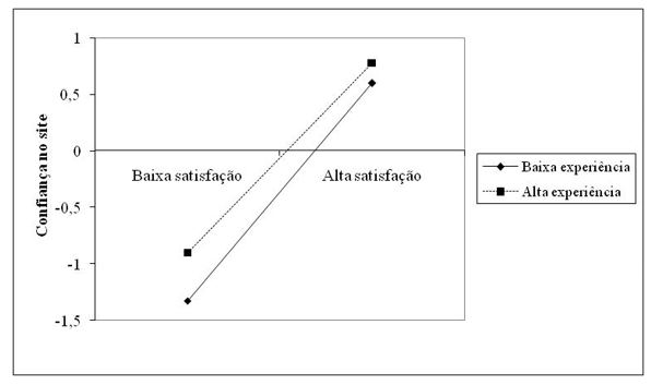 Quatro modelos de regressão foram analisados. No modelo 1, testou-se o efeito independente das variáveis satisfação e experiência sobre a variável dependente confiança no website, enquanto que no modelo 2 testou-se o efeito da familiaridade e da experiência sobre a satisfação com o website. No modelo 3, testou-se o efeito moderador da experiência na relação satisfação-confiança e, no modelo 4, o efeito moderador da experiência na relação familiaridade-satisfação. Os resultados revelaram correlações positivas significantes entre confiança e experiência (r = 0.679, p 0.01), confiança e satisfação (r = 0.914, p 0.01), confiança e familiaridade (r = 0.695, p 0.01), satisfação e experiência (r = 0.638, p 0.01), satisfação e familiaridade (r = 0.732, p 0.01) e experiência e familiaridade (r = 0.477, p 0.01). A análise do modelo de regressão 1 mostra que a confiança no website de compras é maior conforme aumentam a satisfação (β = 0.772, p 0.001) e experiência com o website de compras (β = 0.162, p 0.001), corroborando H4 e H2 (R2 ajustado = 0.849; F (3; 186) = 355,9, p 0.001). Já a familiaridade não se mostrou significante para explicar a confiança no website de compras (p 0.5), rejeitando H6. Por outro lado, a análise do modelo de regressão 2 mostrou que a familiaridade (β = 0.553, p 0.001) e a experiência (β = 0.374, p 0.001) se revelaram significantes para explicar a satisfação com o website de compras, confirmando H5 e H1 (R2 ajustado = 0.640; F (2; 187) = 169,2, p 0.001). A Tabela 1 mostra que a experiência exerce um possível efeito moderador na relação satisfação-confiança (β = -0.69, p = 0.05). Portanto, aceita-se H3. A Tabela 1 mostra também que a variável experiência não modera a relação familiaridade-satisfação, o que leva à rejeição de H7 (p 0.05). A análise da moderação foi feita de acordo com o procedimento proposto por Aiken e West (1991), ou seja, o termo de interação resultou do produto entre a variável moderadora experiência com o website de compras e as variáveis independentes satisfação com o website de compras (modelo 3) e familiaridade com o website de compras (modelo 4), depois de centrá-las subtraindo-lhes as médias. O efeito moderador da experiência na relação satisfação-confiança (H3) pode ser obsevado na Figura 1. O relacionamento satisfação-confiança é mais forte quando a experiência com o website de compras é maior, e mais fraco quando é a experiência é menor. O Quadro 1 traz o resultado das hipóteses testadas nos modelos de regressão.