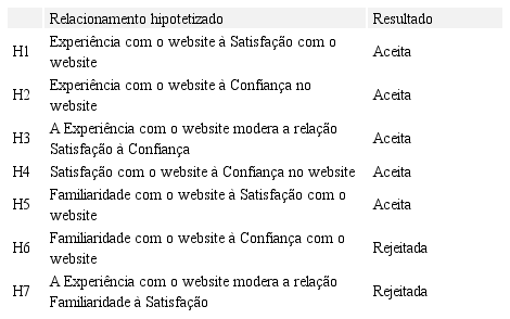 Por fim H7 – a experiência modera o relacionamento entre a familiaridade e a satisfação – também foi rejeitada contrariando a especulação de Ha e Perks (2005). Não há evidências de que a relação entre familiaridade e satisfação seja moderada pela experiência. Isso indica a possibilidade de usuários com alta familiaridade com o website de compras ficarem satisfeitos independentemente de a experiência ter sido positiva ou negativa. Pesquisas futuras devem explorar potenciais moderadores da relação familiaridade-satisfação.