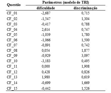 O modelo foi gerado a partir do pacote irtoys do software R (Partchev, 2010). A Tabela 1 contém estatísticas descritivas dos itens.