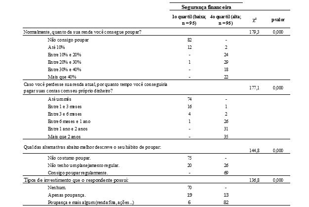 Para os quatro indicadores de segurança financeira relatados na Tabela 2, percebe-se clara correspondência entre a definição conceitual e os resultados observados: pessoas com pontuações mais baixas em segurança financeira, comparadas àquelas com pontuações mais elevadas, poupam menos e menos frequentemente, aguentam menos tempo pagar suas contas em caso de perda da fonte de renda, e possuem menos tipos de investimento (entre poupança, renda fixa, ações, previdência privada e outros). As duas colunas à direita da Tabela 2 trazem estatísticas de testes de qui-quadrado de independência (χ² observado e valor-p) que sustentam essas afirmações.