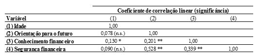 Adotamos o construto de respostas socialmente desejáveis para essa análise, por não haver qualquer expectativa teórica de que deva correlacionar-se com os construtos de segurança financeira, orientação para o futuro ou conhecimento financeiro. O uso de uma escala de respostas socialmente desejáveis tem como finalidade identificar esse tipo de fenômeno, o qual pode introduzir ruídos aos dados coletados e comprometer a validade dos construtos mensurados na pesquisa (Mick, 1996). Quando os respondentes, assim como neste estudo, preenchem os questionários de forma anônima e online, espera-se que o efeito negativo das respostas socialmente desejáveis não seja verificado. De fato, nossas análises apontam que não há efeito de respostas socialmente desejáveis – há ausência de correlação significante entre esse construto e os construtos da pesquisa.