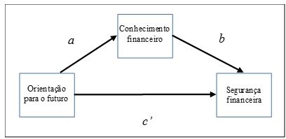 Foi utilizado um modelo de mediação simples para avaliar a relação entre orientação para o futuro, conhecimento financeiro e segurança financeira.