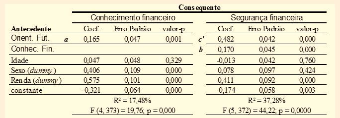 A análise do modelo de mediação revela que, quanto maior o conhecimento financeiro, maior a segurança financeira (o caminho b tem coeficiente igual a 0,170, positivo e significante) e quanto maior a orientação para o futuro, maior a segurança financeira (o caminho c’ tem coeficiente igual a 0,482, positivo e significante). Dessa forma, há evidência para sustentar as hipóteses H1 e H2.