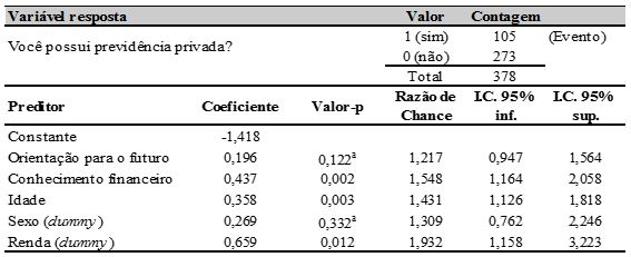 Buscando evidência adicional de validade dos achados desta pesquisa, montou-se um modelo de regressão logística binária em que os mesmos preditores de ‘segurança financeira’ (quais sejam: orientação para o futuro, conhecimento financeiro, idade, sexo e renda) foram utilizados para explicar a variável resposta ‘possuir aplicação de previdência privada’ (0: respondente não possui aplicação de previdência privada; 1: respondente possui aplicação de previdência privada). As estatísticas de ajuste do modelo são oferecidas na Tabela 5.