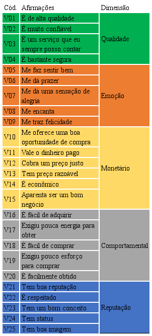 Results: The results demonstrate that the theoretical constructs of the SERV-PERVAL model can predict the perceived value by Brazilian consumers. Quality is the biggest impact factor in the perception of value, followed by the reputation and emotion dimensions. On the other hand, the behavioral and monetary dimensions contributed in a smaller proportion to the perceived value.